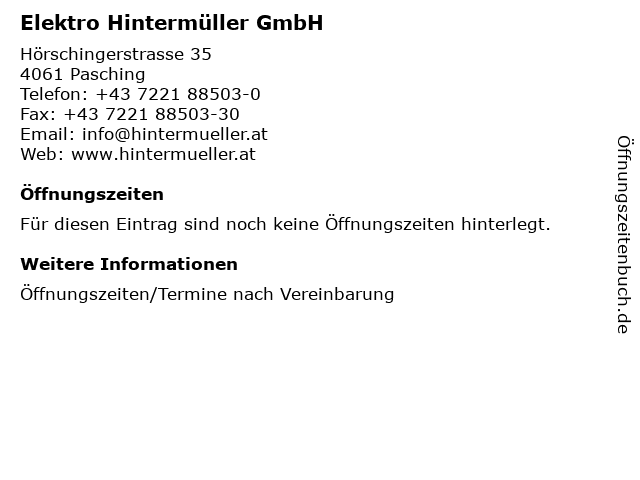 | Öffnungszeiten Elektro Hintermüller GmbH in Pasching anzeigen | |