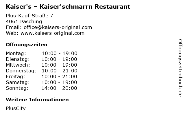| Öffnungszeiten Kaiser's – Kaiser'schmarrn Restaurant in Pasching anzeigen | |