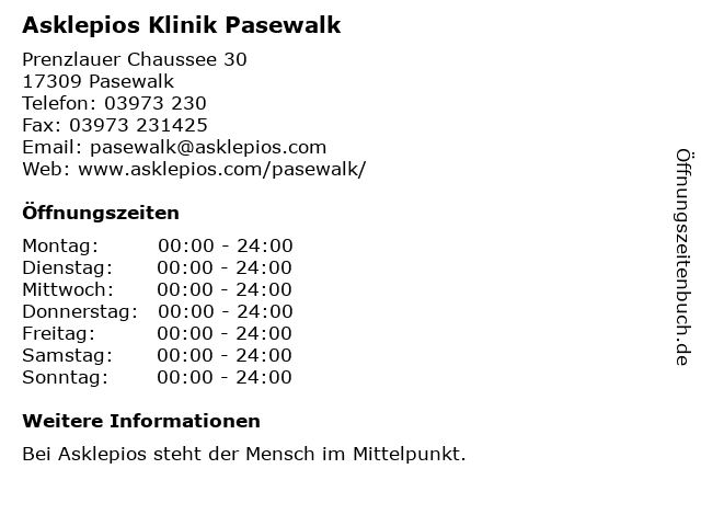 | Öffnungszeiten Asklepios Klinik Pasewalk in Pasewalk anzeigen | |