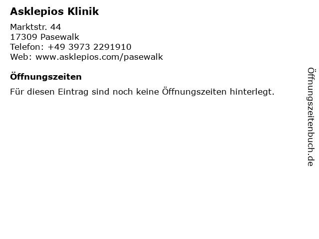| Öffnungszeiten Asklepios Klinik in Pasewalk anzeigen | |
