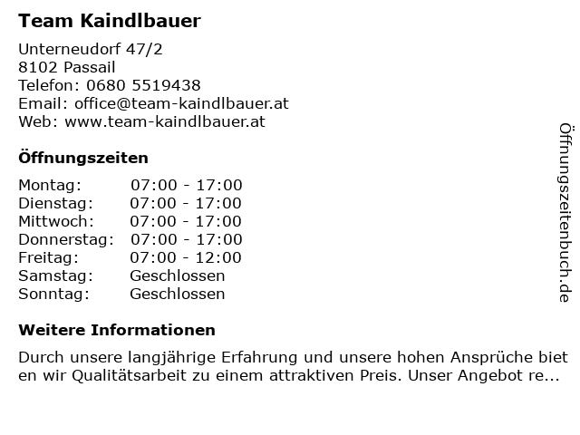 | Öffnungszeiten Team Kaindlbauer in Passail anzeigen | |