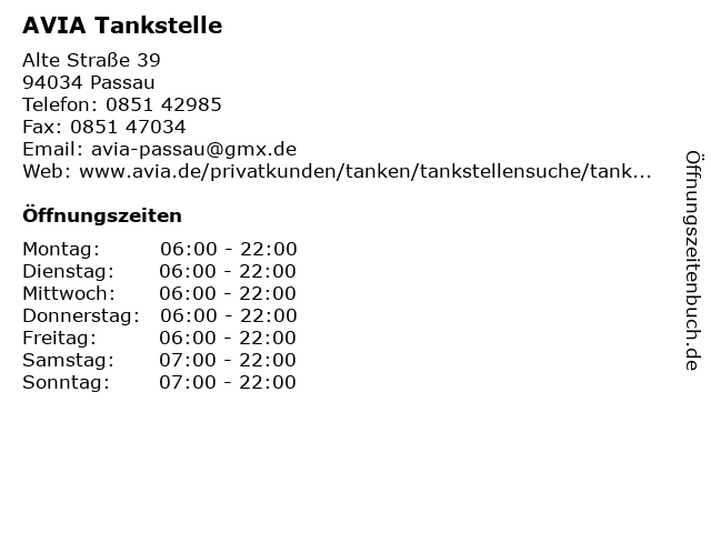 | Öffnungszeiten AVIA Tankstelle in Passau anzeigen | |