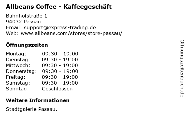 | Öffnungszeiten Allbeans Coffee - Kaffeegeschäft in Passau anzeigen | |