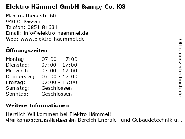 | Öffnungszeiten Elektro Hämmel GmbH & Co. KG in Passau anzeigen | |
