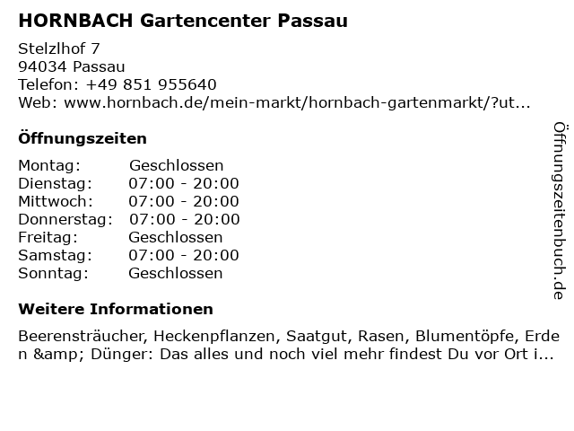 | Öffnungszeiten HORNBACH Gartencenter Passau in Passau anzeigen | |