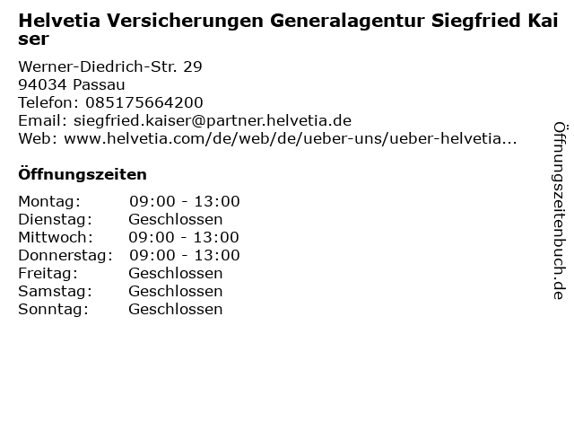 2 Helvetia Versicherungen - Generalagentur Ferdinand Url (Entfernung: 2,71 km) Kühberg 18a, 94032 Passau 5 Versicherungskammer Bayern - Generalagentur Daniel Brummer (Entfernung: 3,08 km) Bahnhofstraße 36, 94032 Passau 6 Autohaus Zapff - Pächter Siegfried Riermeier - Verkauf / Büro (Entfernung: 3,93 km) Passauer Straße 23, 94121 Salzweg |