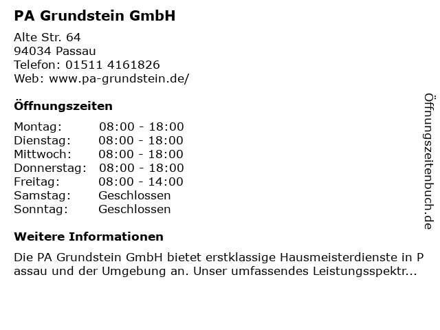 | Öffnungszeiten PA Grundstein GmbH in Passau anzeigen | |