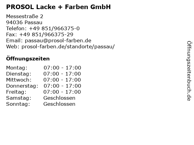 | Öffnungszeiten PROSOL Lacke + Farben GmbH in Passau anzeigen | |