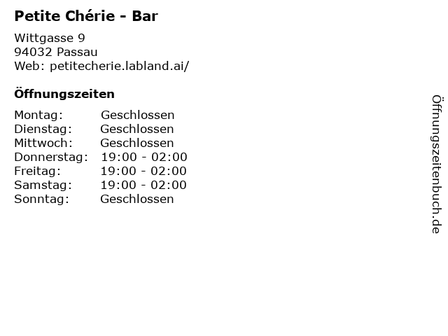 | Öffnungszeiten Petite Chérie - Bar in Passau anzeigen | |