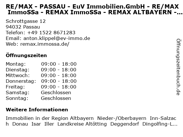 Branchen & Suchbegriffe zu RE/MAX - PASSAU - EuV Immobilien.GmbH - RE/MAX ImmoSSa - REMAX ImmoSSa - REMAX ALTBAYERN - vormals Engel & Völkers:altbayern, engel, euv, immobilien.gmbh, immossa, re/max, remax, vormals, völkers |