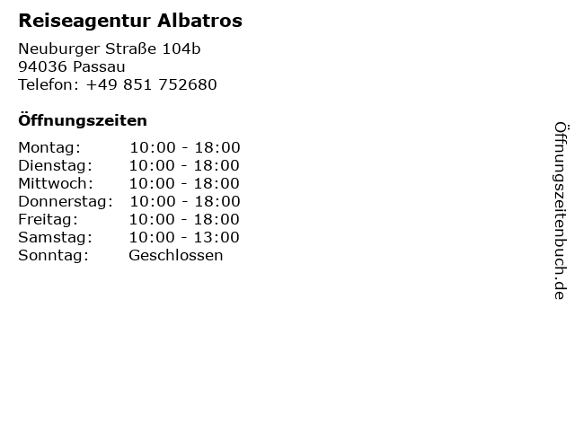 | Öffnungszeiten Reiseagentur Albatros in Passau anzeigen | |