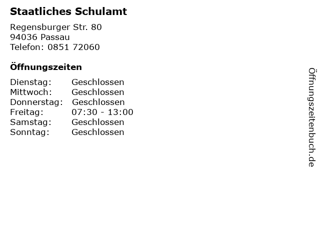 | Öffnungszeiten Staatliches Schulamt in Passau anzeigen | |