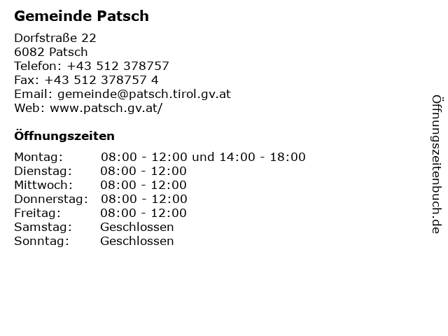 | Öffnungszeiten Gemeinde Patsch in Patsch anzeigen | |