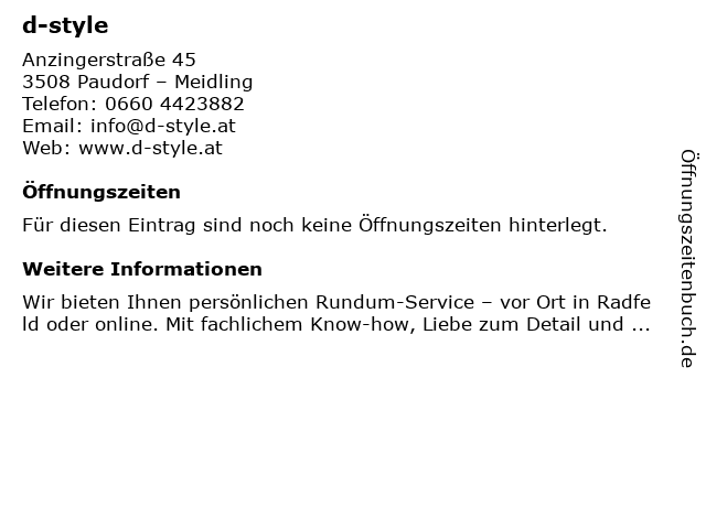 | Öffnungszeiten d-style in Paudorf – Meidling anzeigen | |