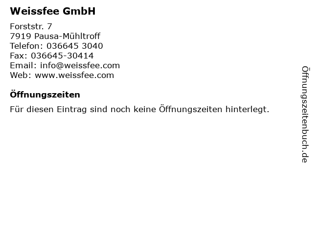| Öffnungszeiten Weissfee GmbH in Pausa-Mühltroff anzeigen | |