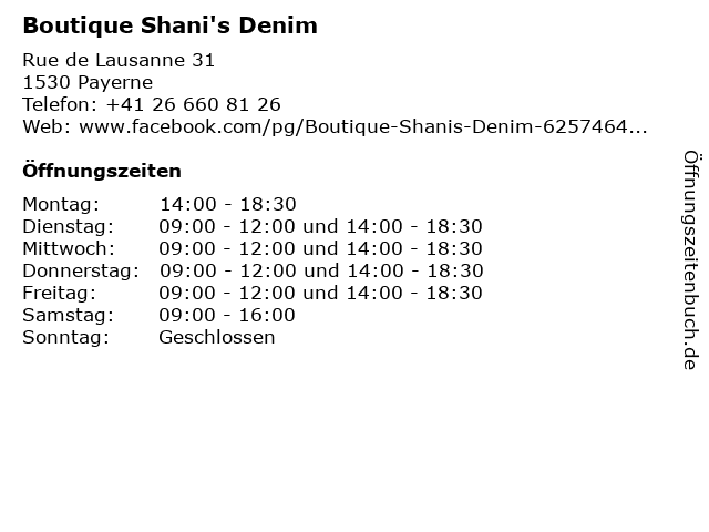 | Öffnungszeiten Boutique Shani's Denim in Payerne anzeigen | |