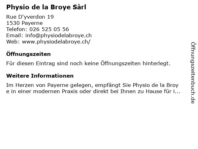 | Öffnungszeiten Physio de la Broye Sàrl in Payerne anzeigen | |