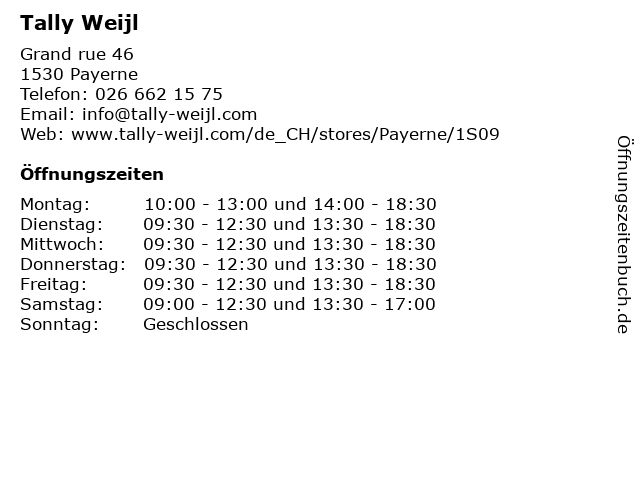 | Öffnungszeiten Tally Weijl in Payerne anzeigen | |