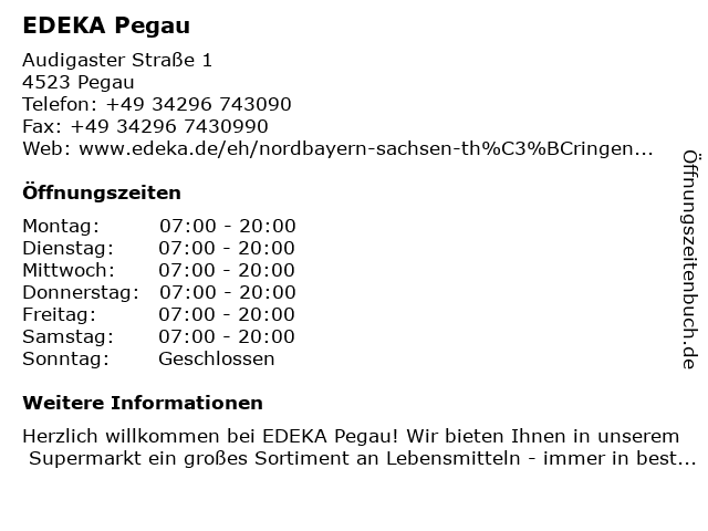 | Öffnungszeiten EDEKA Pegau in Pegau anzeigen | |