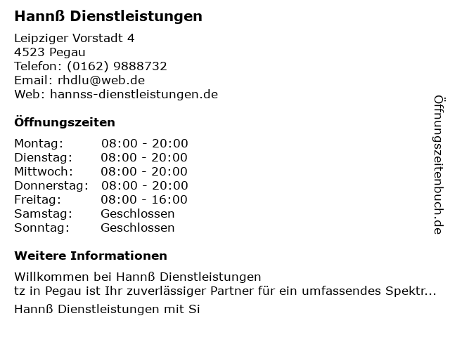 | Öffnungszeiten Hannß Dienstleistungen in Pegau anzeigen | |