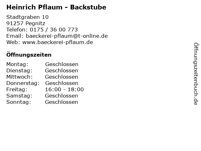 | Öffnungszeiten Heinrich Pflaum - Backstube in Pegnitz anzeigen | |