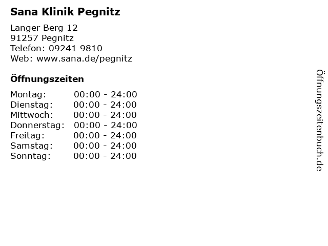 | Öffnungszeiten Sana Klinik Pegnitz in Pegnitz anzeigen | |