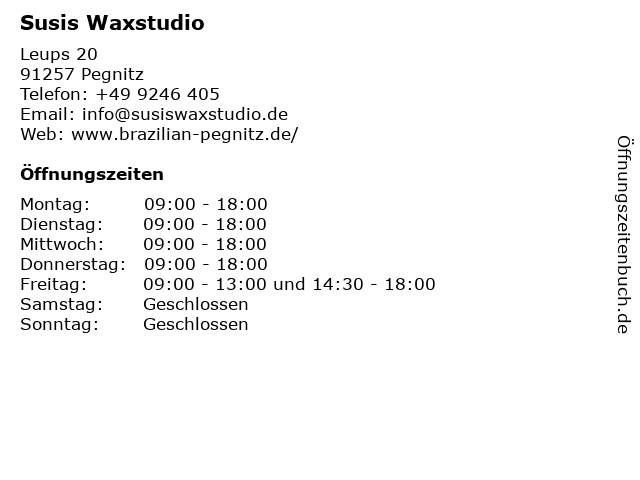 | Öffnungszeiten Susis Waxstudio in Pegnitz anzeigen | |