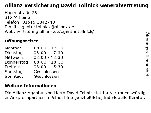 1 Allianz Versicherung Thorsten Höppner Generalvertretung (Entfernung: 0,23 km) Kantstraße 24, 31224 Peine 3 Allianz Versicherung Bennet Ohle Generalvertretung (Entfernung: 14,05 km) Schloßstraße 6 a, 38179 Schwülper 5 Mecklenburgische Versicherungsgruppe - Generalvertretung Christof Laakmann (Entfernung: 15,93 km) Judenstr. 5, 31191 Algermissen 6 Allianz Versicherung Heiko Mögebier Generalvertretung (Entfernung: 18,53 km) Weserstraße 11, 31275 Lehrte |