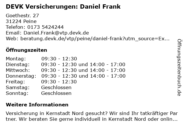 Branchen & Suchbegriffe zu DEVK Versicherungen: Daniel Frank:altersvorsorge, autoversicherung, berufsunfähigkeitsversicherung, daniel, devk, frank, gebäude- und hausratsversicherung, gewerbeversicherung, kfz-versicherung (motorrad), lebensversicherung, mietrechtsschutzversicherung, reiseversicherungsagentur, versicherungen |
