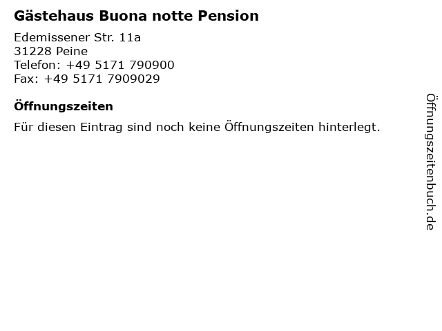 | Öffnungszeiten Gästehaus Buona notte Pension in Peine anzeigen | |