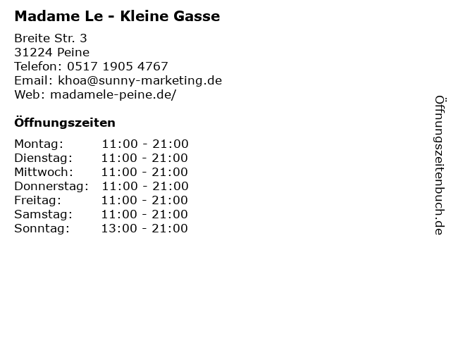 | Öffnungszeiten Madame Le - Kleine Gasse in Peine anzeigen | |