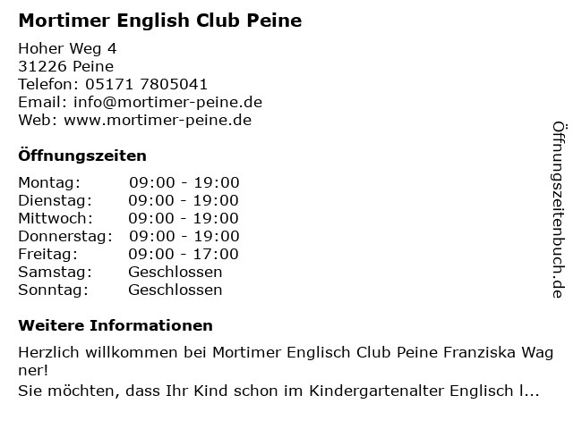 | Öffnungszeiten Mortimer English Club Peine in Peine anzeigen | |