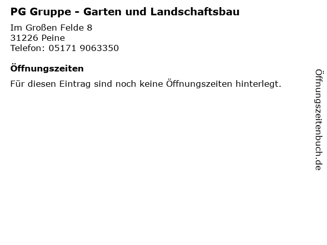 2 PG Gruppe Containerdienst & Schüttguthandel GmbH (Entfernung: 0,00 km) Im Großen Felde 8, 31226 Peine 4 Alateen Gruppe Peine (in geraden Kalenderwochen) - Haus der Diakonie (Entfernung: 1,35 km) Bahnhofstr. 8, 31226 Peine 6 |