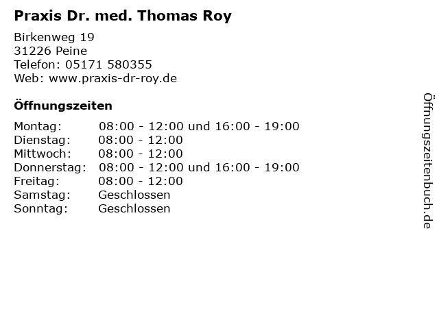 | Öffnungszeiten Praxis Dr. med. Thomas Roy in Peine anzeigen | |