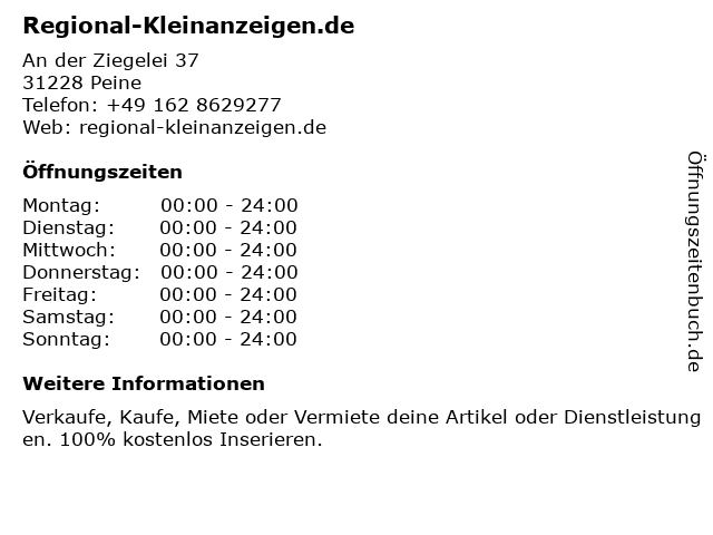 | Öffnungszeiten Regional-Kleinanzeigen.de in Peine anzeigen | |