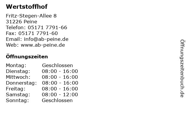 | Öffnungszeiten Wertstoffhof in Peine anzeigen | |