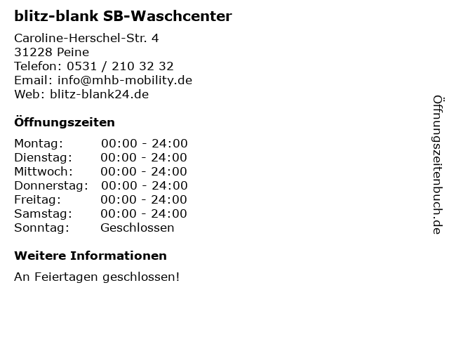 | Öffnungszeiten blitz-blank SB-Waschcenter in Peine anzeigen | |