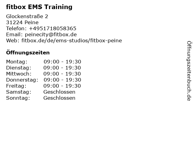 | Öffnungszeiten fitbox EMS Training in Peine anzeigen | |