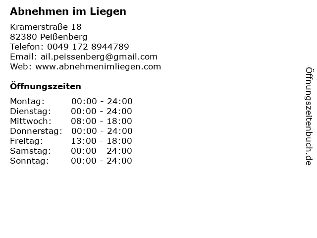 | Öffnungszeiten Abnehmen im Liegen in Peißenberg anzeigen | |