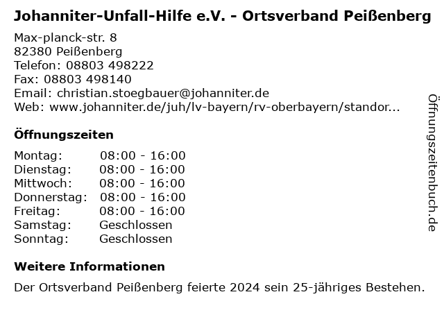 Branchen & Suchbegriffe zu Johanniter-Unfall-Hilfe e.V. - Ortsverband Peißenberg:e.v., gemeinnützige organisation, hilfe, hilfsorganisation, johanniter, ortsverband, peißenberg, sozialarbeit, unfall, verband, wohlfahrtseinrichtung |
