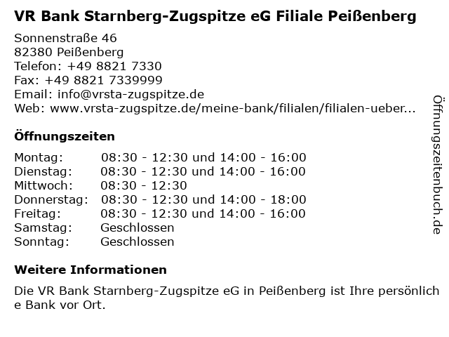 2 VR Bank Starnberg-Zugspitze eG SB-Filiale Oberhausen (Entfernung: 5,33 km) Bahnhofstraße 37, 82386 Oberhausen 3 VR Bank Starnberg-Zugspitze eG SB-Filiale Eberfing (Entfernung: 10,53 km) Escherstraße 1, 82390 Eberfing 5 VR Bank Starnberg-Zugspitze eG Filiale Bad Kohlgrub (Entfernung: 13,49 km) Hauptstraße 3, 82433 Bad Kohlgrub 6 |