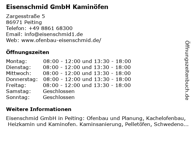 | Öffnungszeiten Eisenschmid GmbH Kaminöfen in Peiting anzeigen | |