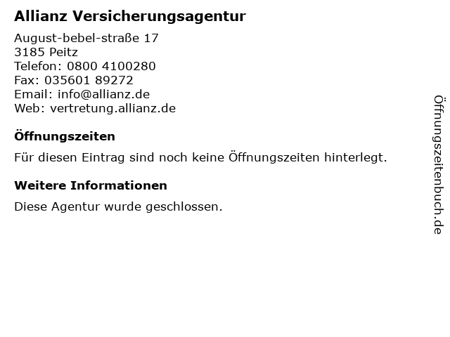 | Öffnungszeiten Allianz Versicherungsagentur in Peitz anzeigen | |