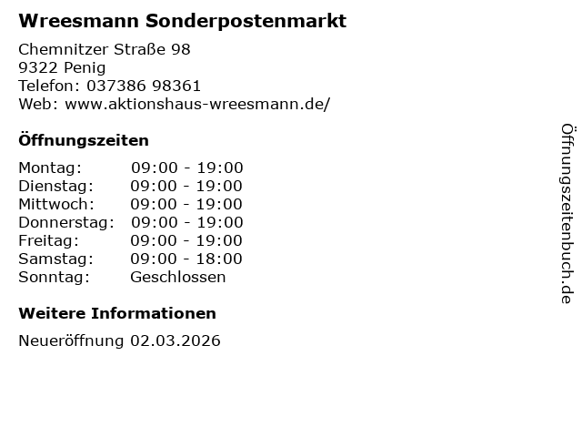 | Öffnungszeiten Wreesmann Sonderpostenmarkt in Penig anzeigen | |