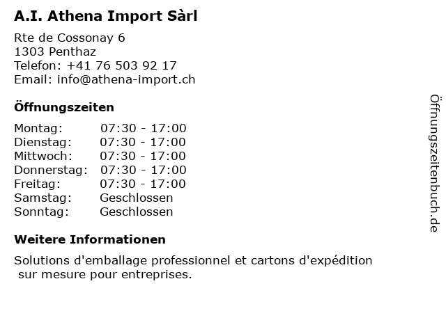 | Öffnungszeiten A.I. Athena Import Sàrl in Penthaz anzeigen | |