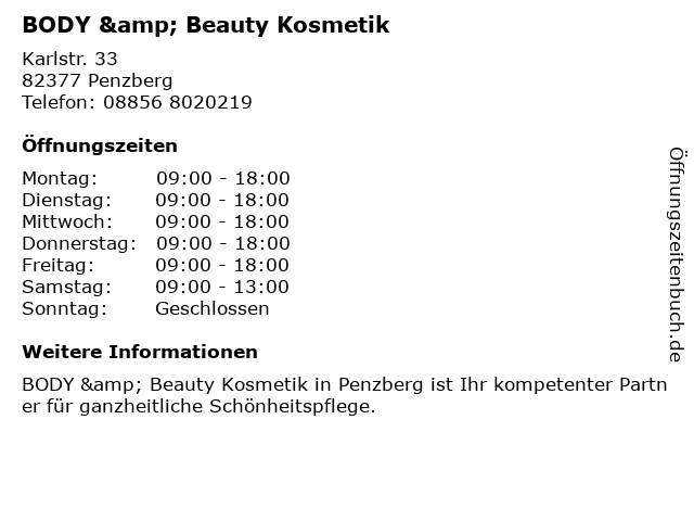 | Öffnungszeiten BODY & Beauty Kosmetik in Penzberg anzeigen | |