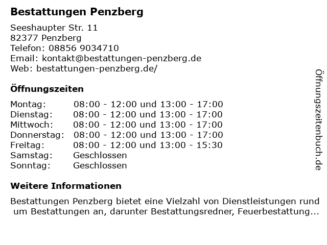 | Öffnungszeiten Bestattungen Penzberg in Penzberg anzeigen | |