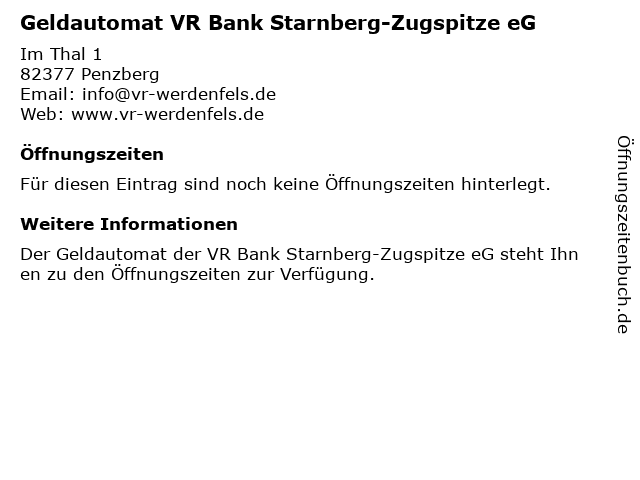 | Öffnungszeiten Geldautomat VR Bank Starnberg-Zugspitze eG in Penzberg anzeigen | |