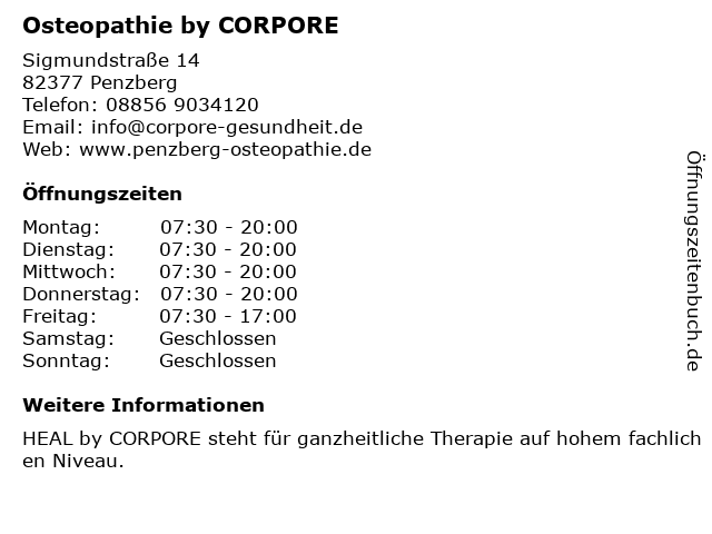 | Öffnungszeiten Osteopathie by CORPORE in Penzberg anzeigen | |
