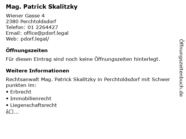 | Öffnungszeiten Mag. Patrick Skalitzky in Perchtoldsdorf anzeigen | |